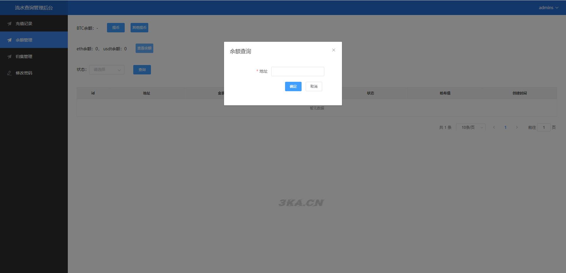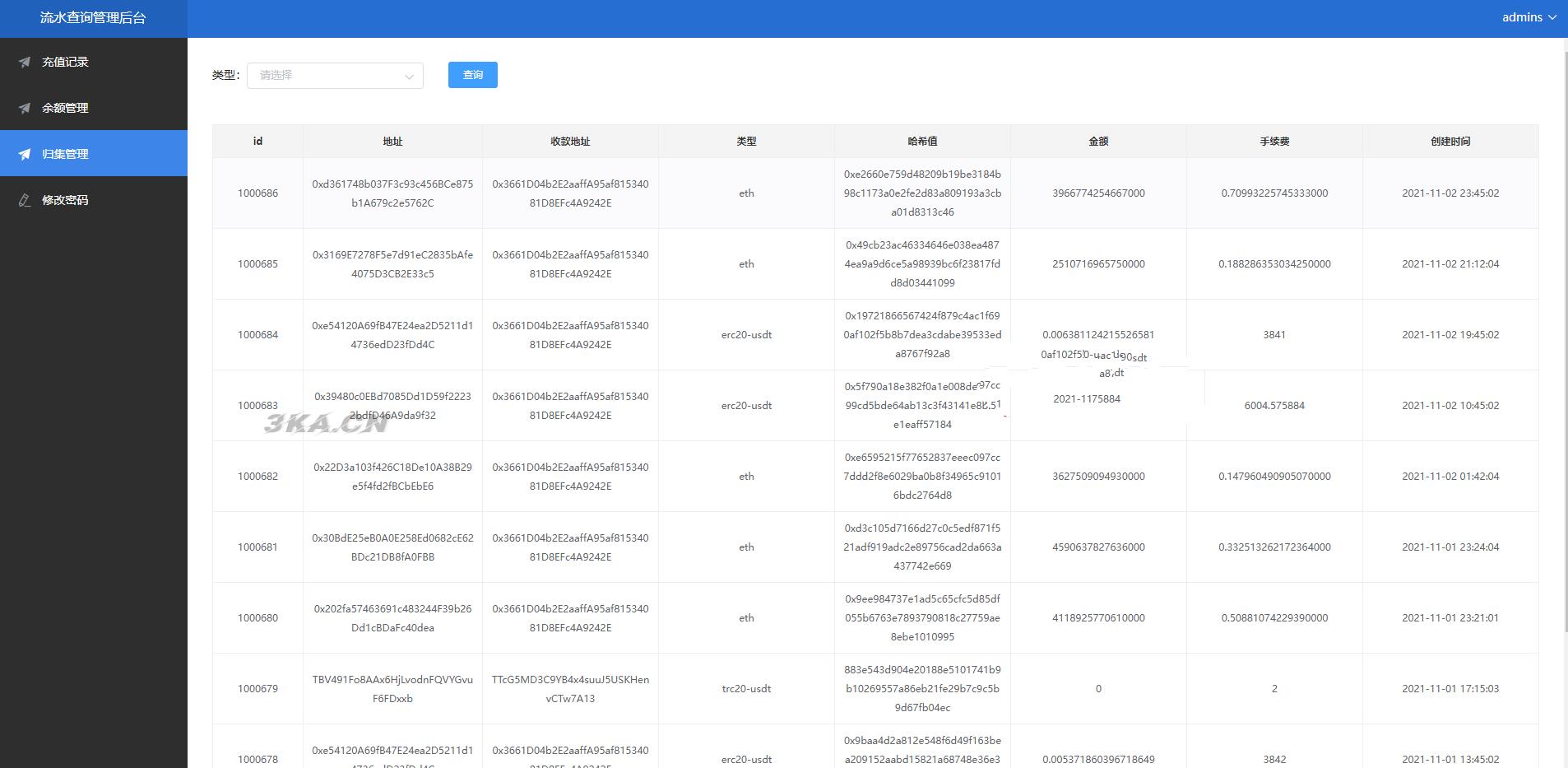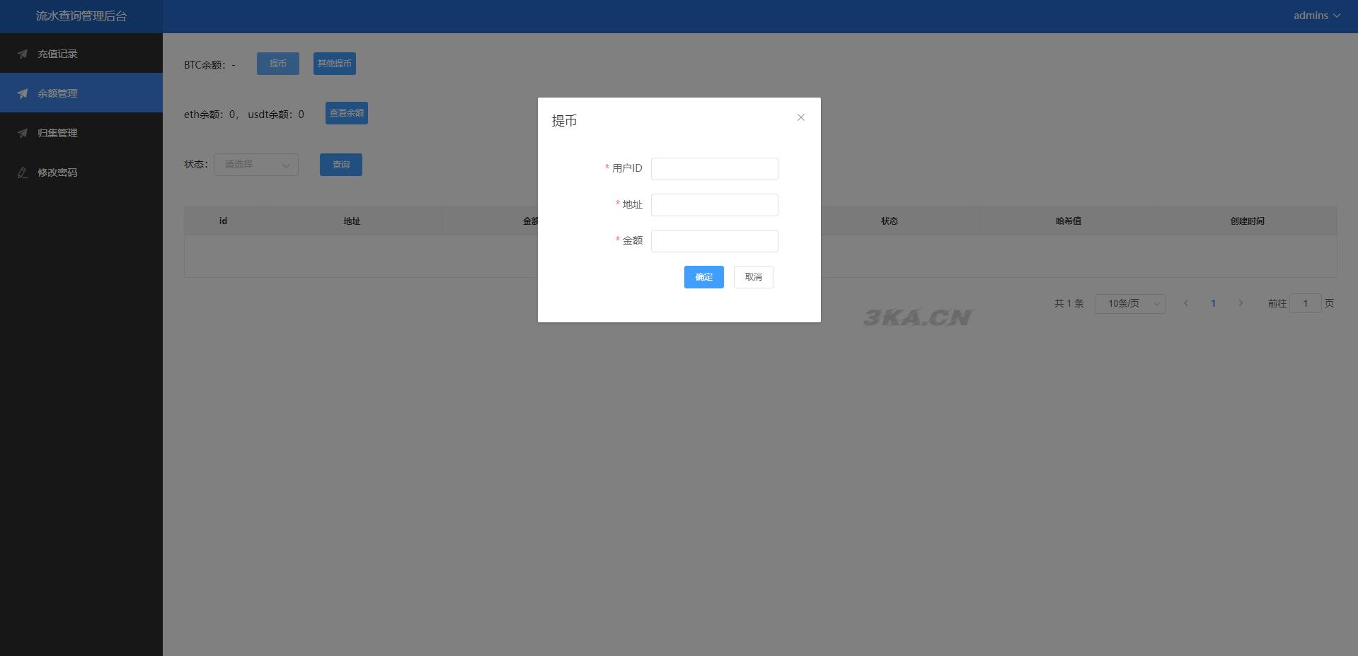 二开版流水查询系统/虚拟币查询多方式提币系统系统单独二开了提币,支持USDT-ERC20、USDT-TRC20、ETH方式提币支持单独地址余额查询,注意的是系统查询的API应该是对接第三方,现在不清楚能不能用了源码自行研究