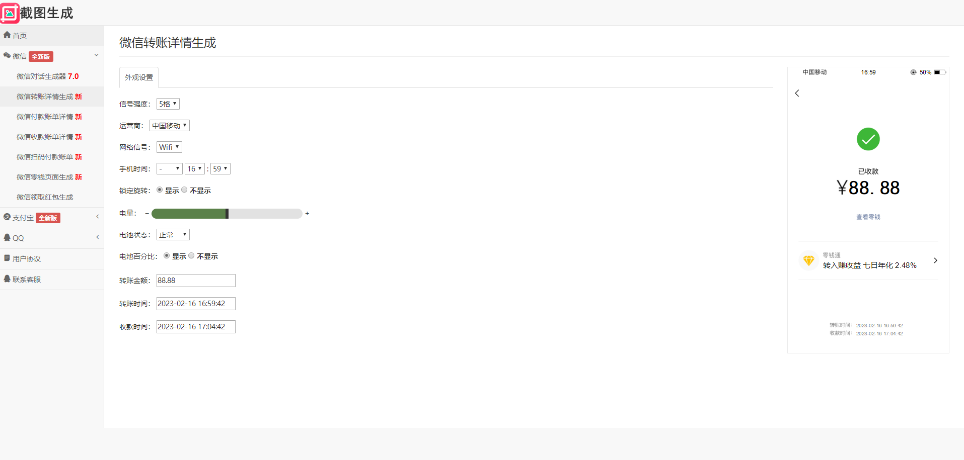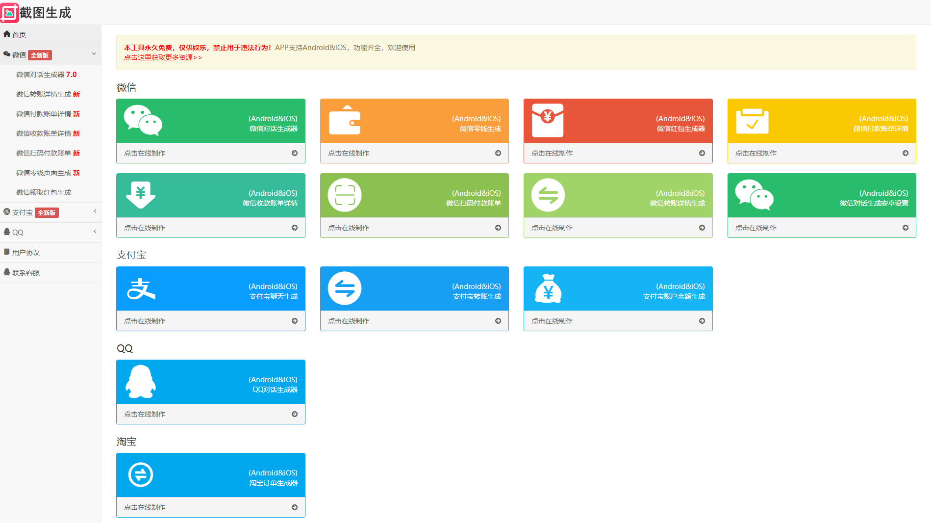 在线一键制作各种截图生成,包含生成功能:微信对话、微信领取红包、微信付款详情、微信收款详情、微信转账详情、微信零钱页面详情、微信扫码付款账单、微信对话和红包带安卓设置、微信朋友圈转发详情、支付宝聊天详情、支付宝转账详情、支付宝账户余额详情、淘宝订单详情、QQ聊天详情、手机短信聊天详情!