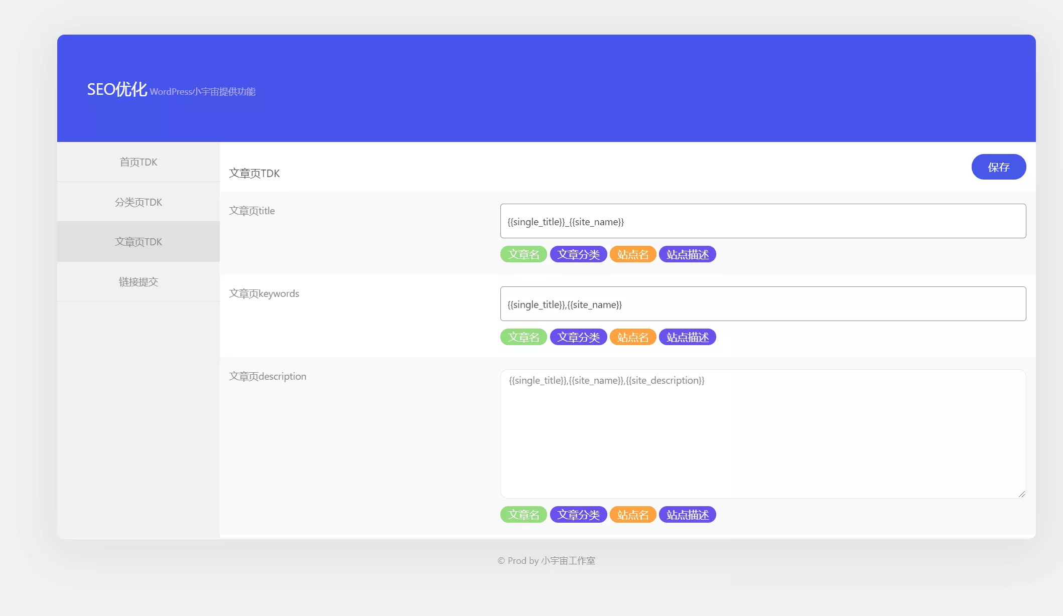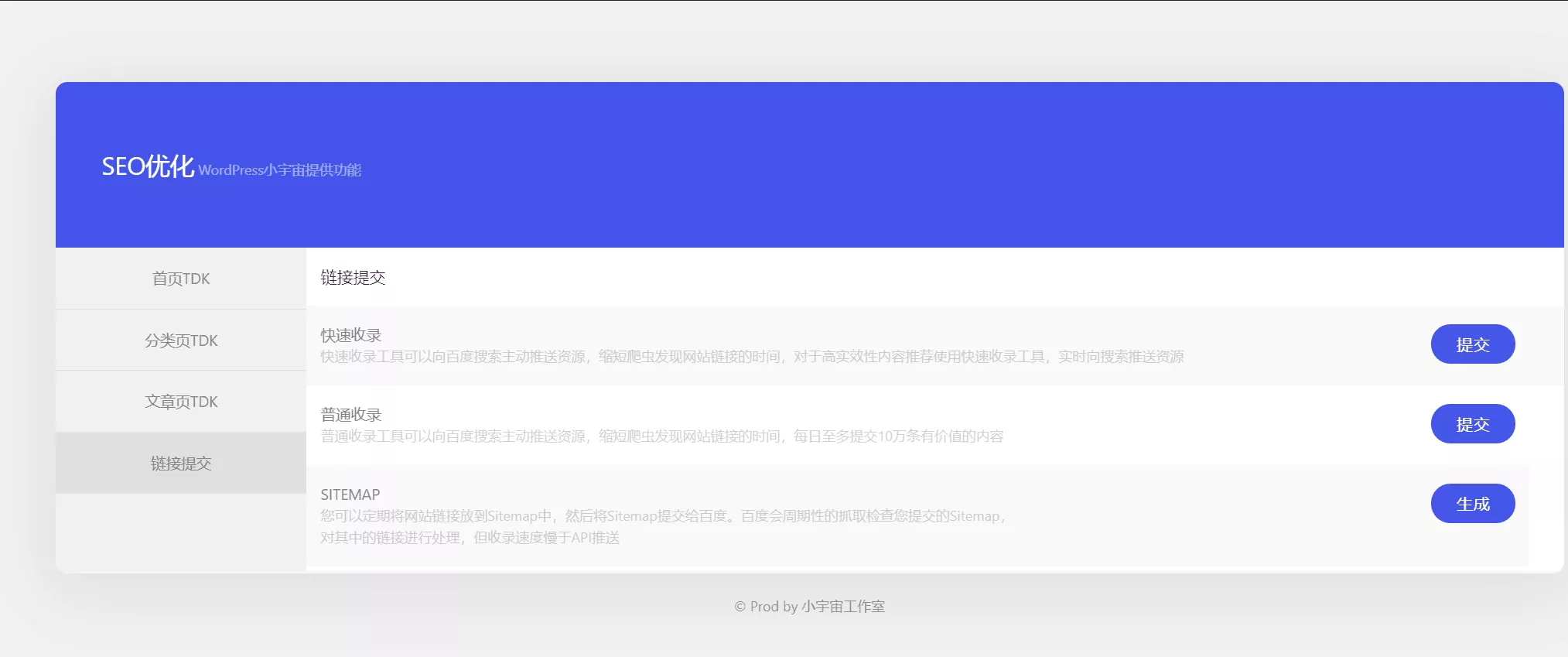 这款WordPress插件主要功能是做站点的seo,可以分别设置首页、文章页、分类页的TDK,也集成了百度的快速提交和普通提交功能,也能生成站点sitemap。