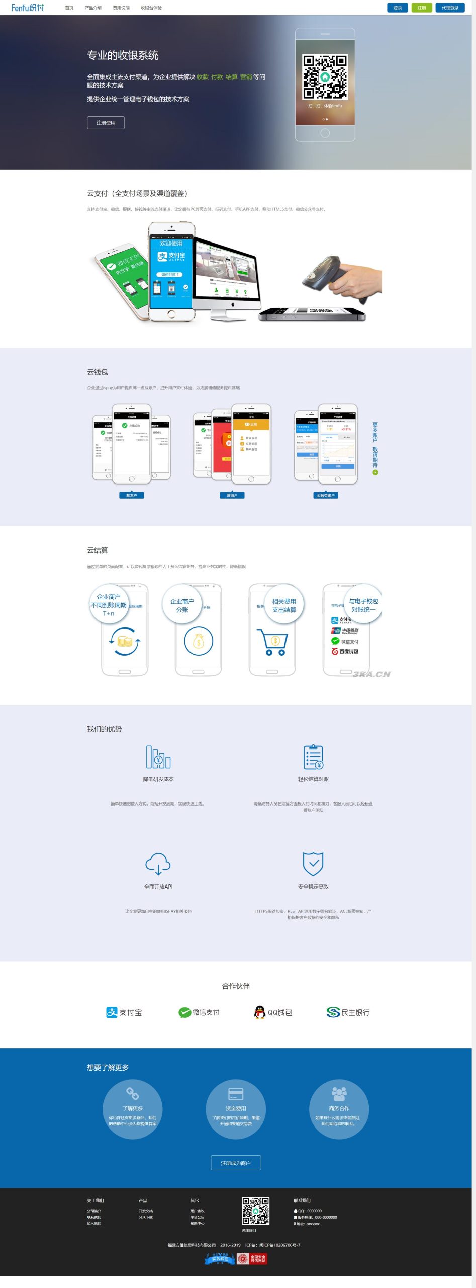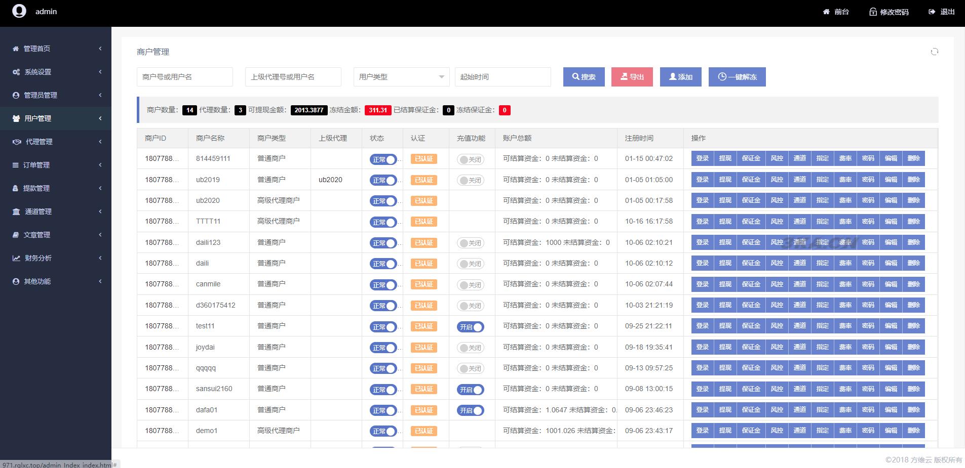 2、商户后台:完整的商户操作中心、账单对账、账单分析、提现功能、代付接口、满足商户的使用。