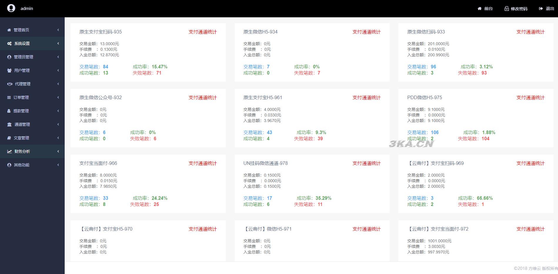 1、管理后台:强大的聚合系统功能满足你全部日常所需、多权限、多商户、通道单独分配等。