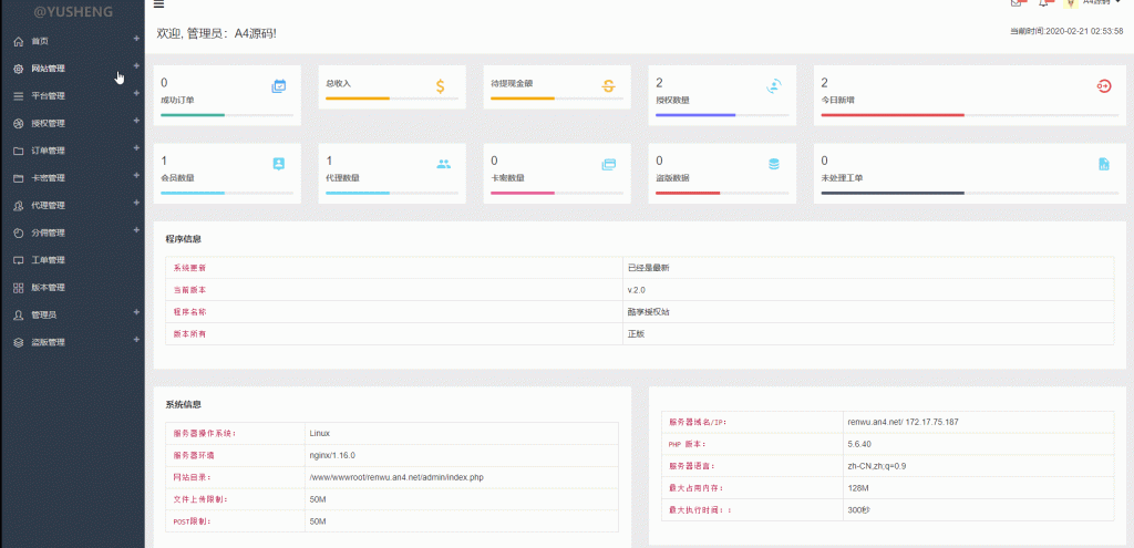 1、网站基本管理、系统设置、公告设置、接口设置、价格设置、下载设置。