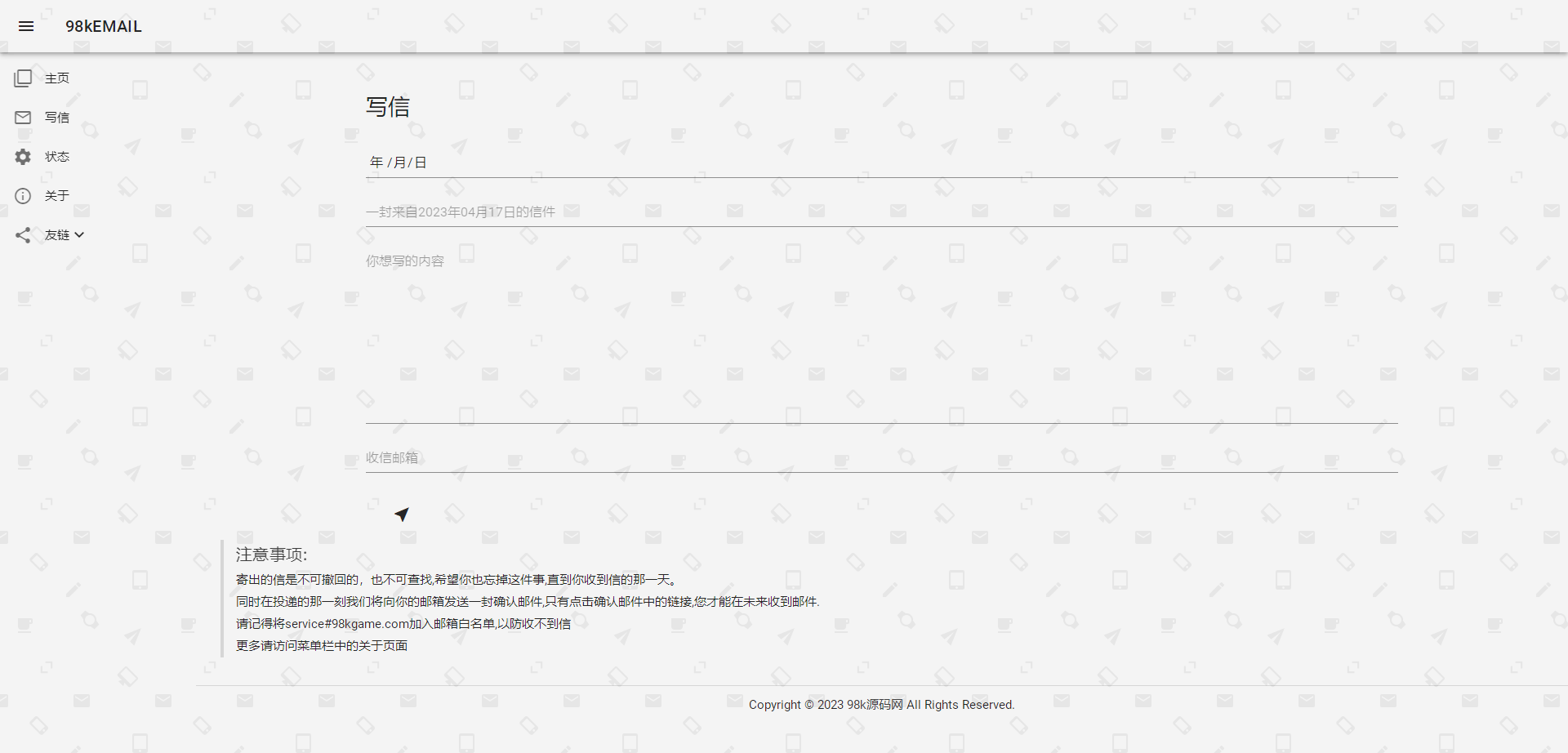 在这个平台寄送出去,寄出的信是不可撤回的,也不可查找,希望你也忘掉这件事,直到你收到信的那一天,也给自己一个惊喜.在那一天回忆起写这封信的时候,带着更多的可能是一种怀念?或许这封邮件会激励你越走越远…