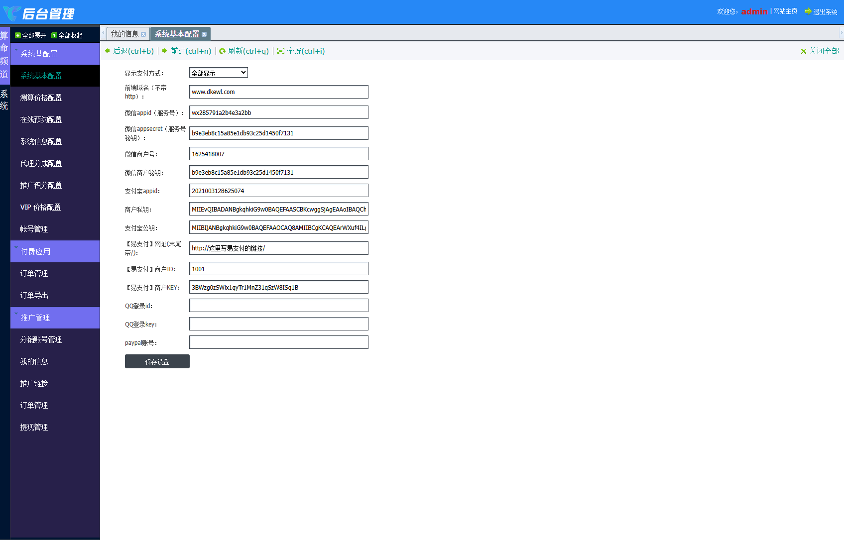 1、登录后台>系统基本配置>这里是支付相关操作设置