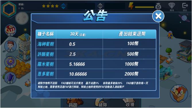 FAF农场:产除作物币不退回;FAD种植可瓜分奖;虫子减产5%;偷取最多被偷20%;FAD种子生命为一天解锁土地,需要使用流通FAF进行解锁,解资土地所使用的FAF自动进入冻结账户。具体功能看截图