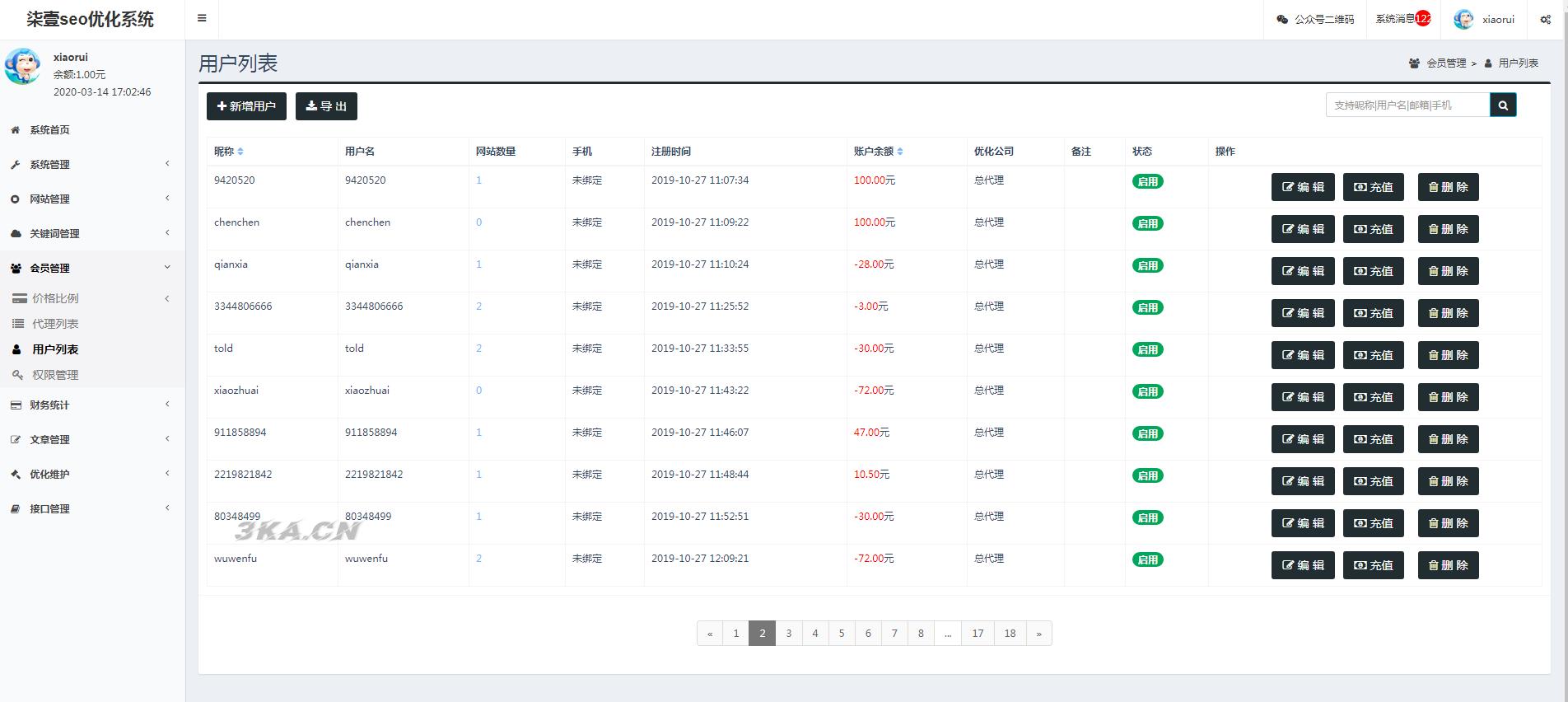 1.会员管理:系统共分三级会员流程。总站管理员, 代理, 和会员(会员分三个等级,普通会员,中级会员和高级会员),总站添加代理用户,给代理用户充值余额,代理给普通用户充值余额,代理也可给3个级别的会员增加关键词的查询比例,如果这个关键词总站给代理是10元,代理给普通用户设置比例是200%, 那么用户添加这个关键词就是20元, 多余的10元就是代理的利润, 代理只能看到他自己的下级会员,设置的比例也只对自己的下级会员有效,如果代理没有设置比例, 那么就将按照总站给代理的价格,也就是原价展示给用户.