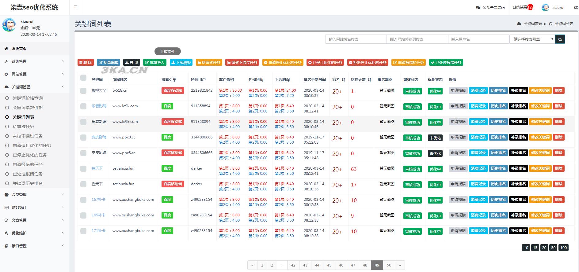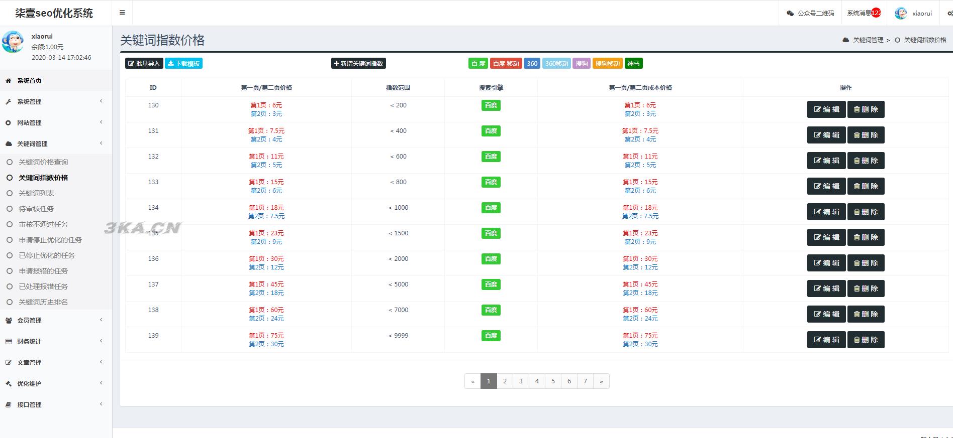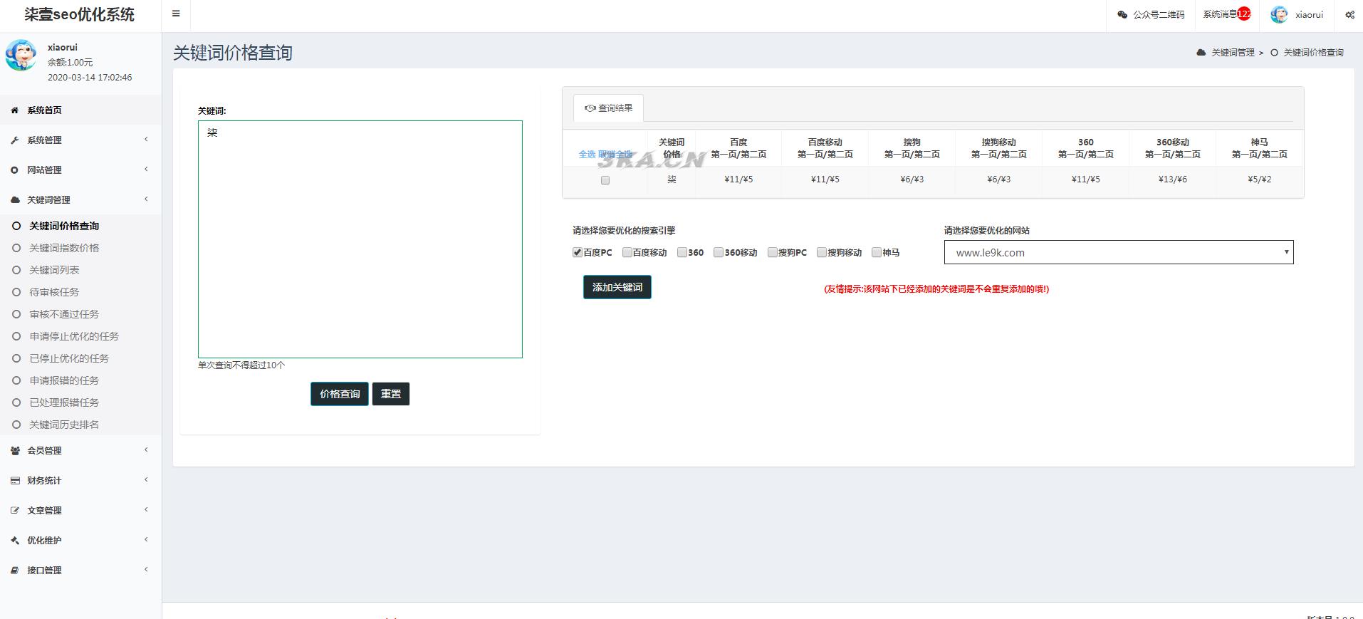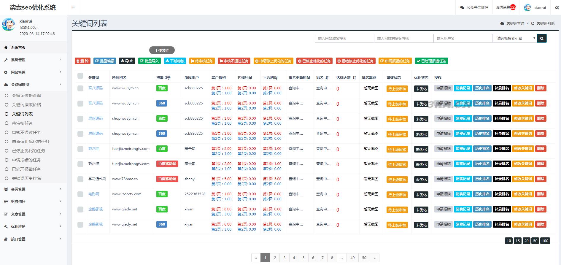 3.关键词管理。总站、代理、普通用户均可添加网站关键词,其中普通用户只能通过关键词价格的方式添加添加关键词,普通用户添加的关键词需要总后台审核;