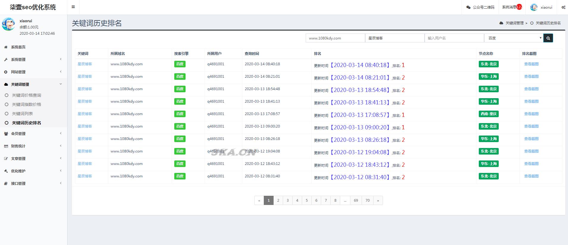 2.网站管理。总站、代理、普通用户均可添加网站,在网站列表页可以看见网站的基本信息,如:域名、网站名称、所属会员、注册时间、关键词数量、达标关键词数量、今日消费、历史消费及网站启用与禁用状态;