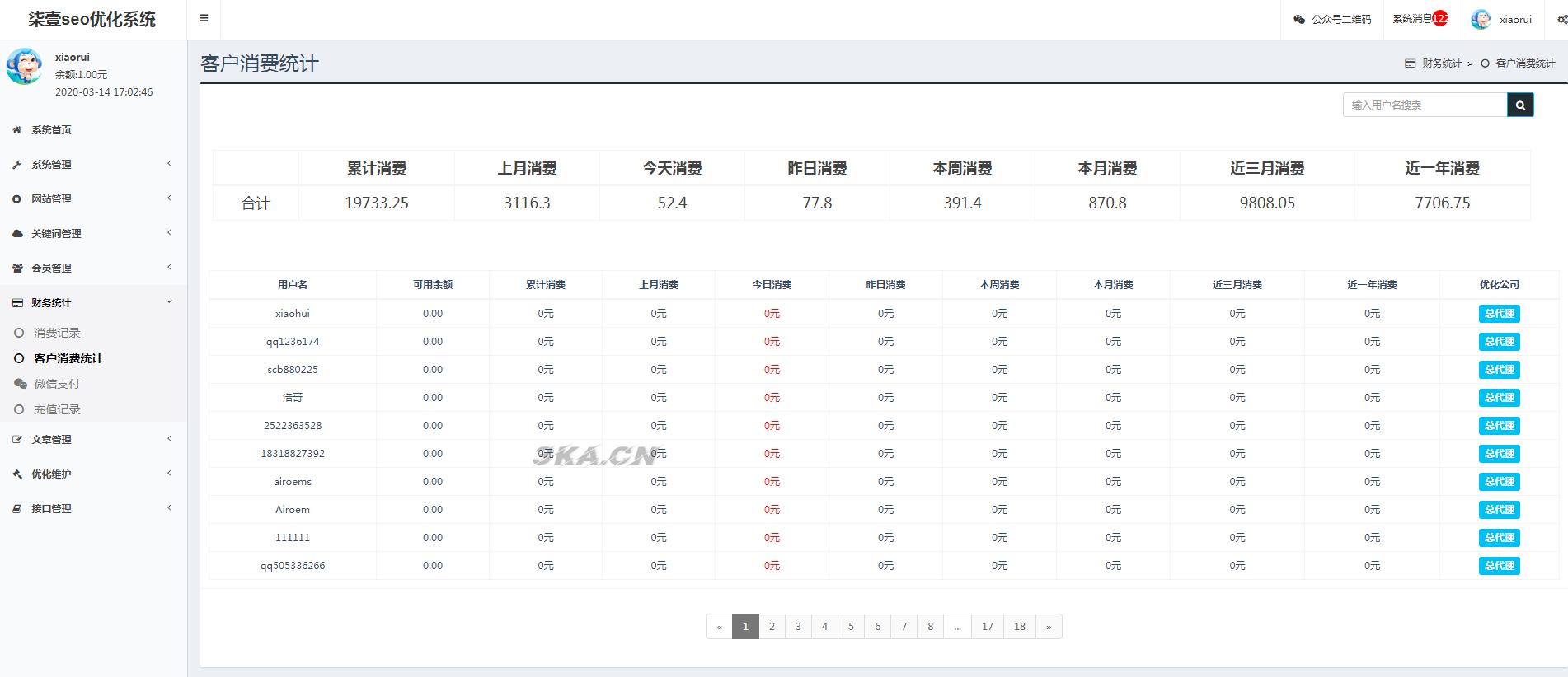 7.财务管理。后台提供清晰、简洁、明了的财务统计分析,总后台及代理用户可以看见所属的代理/用户的可用余额、累计消费、上月消费、本月消费、近3个月消费、近1年消费等情况,同时也可以在后台查看;
